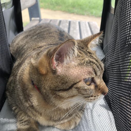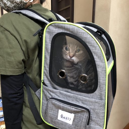 トラコはぺキュートバッグに入ると、ちょっと得意げ。「わたし、今からお母さんと出掛けるの〜」、と他の猫たちに自慢しているようにも見える。
