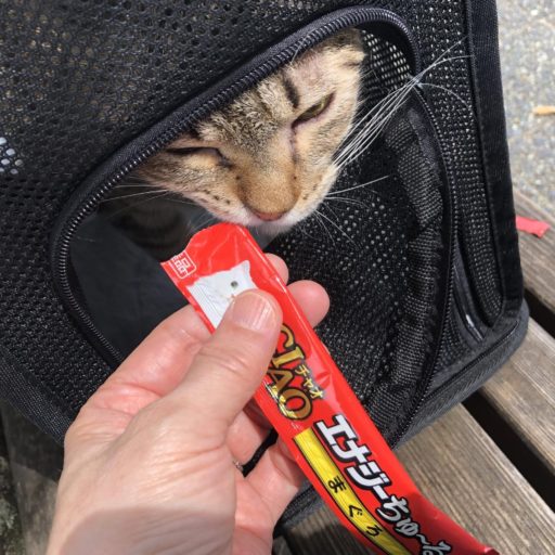 すぐに寛ぎはじめた。水分補給の代わりに大好きな“ちゅるる”をあげる。