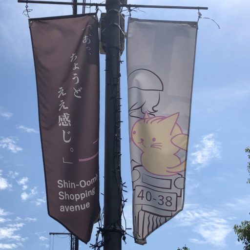 新大宮商店街の街路灯フラッグは猫がバイクに乗っているデザイン。2年前の公募で選ばれたものだそう。