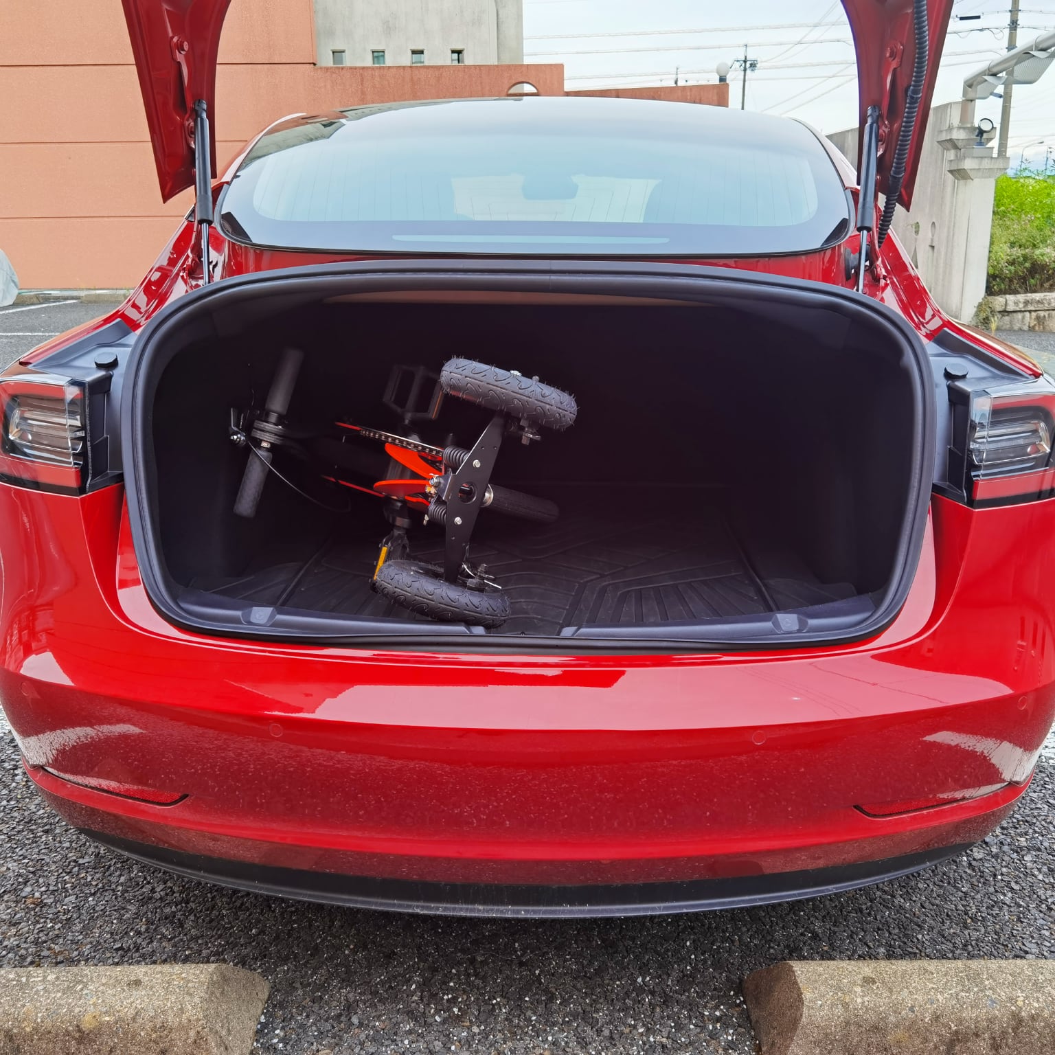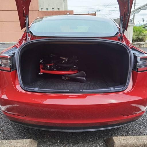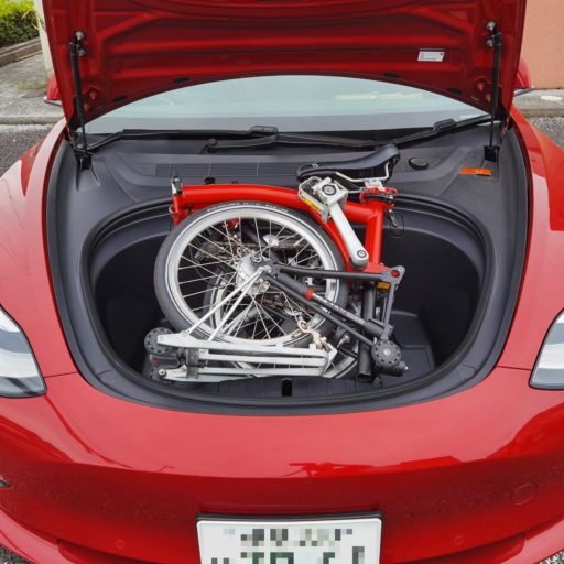 Model 3のリア・トランクは広いので、折り畳んだBromptonを積んでも余裕がある。カバーを取り外すと現れるカーゴ・エリアにも載せられる。トランクに縦置き、あるいはカーゴに横置きができると良いのだが、それだけの空間はない。それでも、リア・トランクにBromptonが2台は載るし、積み重ねれば4〜5台は載りそうだ。ただ、誰もが期待するフロント・トランクは少々狭く、Bromptonが収まらない。