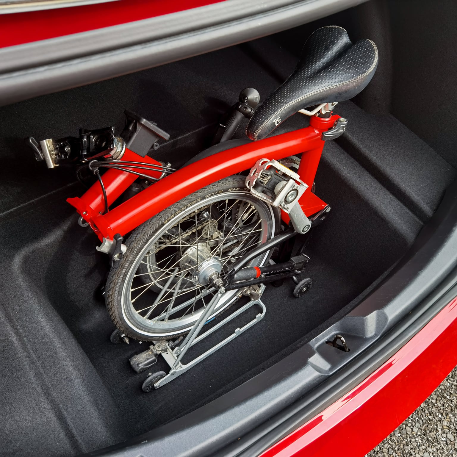 普通自転車の半分サイズを謳うHalfbikeは、横置きにすればリア・トラックに余裕で入る。少々窮屈になるが左右半分に収まるので、2台格納することも可能だろう。さらにリア・シートを畳んでトランク・スルーにすれば縦置きができる。この場合は前後にずらして3台は収納できそうだ。当然のことながら後部に人が座れないので、乗員は2名だけになる。