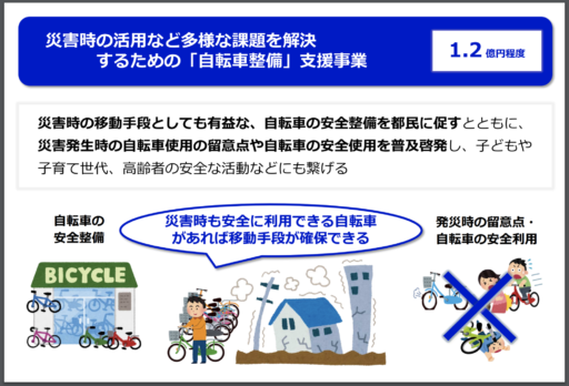 自転車を「災害時移動用自転車」として防災時に使用できるよう準備をすすめる自治体も増えている。例えば、神戸市東灘消防署が監修する「震災時のサバイバルパッケージ」には、自転車について必要な情報が掲載されている。東京都では、都民提案事業として「災害時の活用など多様な課題を解決するための『自転車整備』支援事業」が採択され、2018〜2019年に実施している。