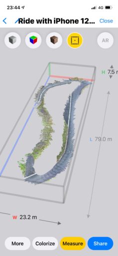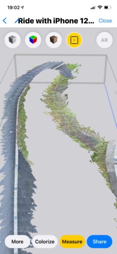 そこでiPad Pro(以下、iPad)とiPhone 12 Pro(以下、iPhone)をハンドル・バーの左右に取り付けて同時に計測してみた。走行した場所は前回と同じ、使用したアプリも前回と同じ3D Scanner App。精緻なスキャンは不要なのでLow Resモードを使用した。その結果としては、iPadは脆弱なアダプタのせいで激しく揺れている。これに対してiPhoneは揺れが少なく、映像も安定している。