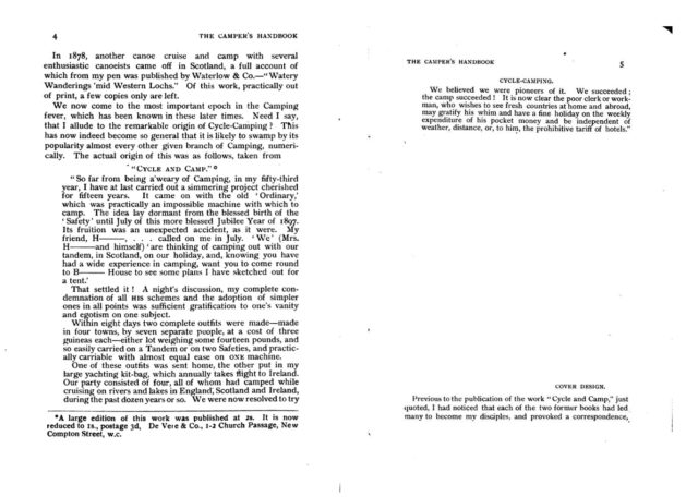 Handbookに引用されたCycle and Campの一節によると、ホールディングは1882年頃から自転車キャンプ旅の構想を持っていたものの、当時のペニー・ファージング自転車(オーディナリー自転車)ではそれは実現不可能だった(1884年にペニー・ファージングで世界一周に出たトーマス・スティーブンスもキャンプ泊はほとんどしていないようである)。