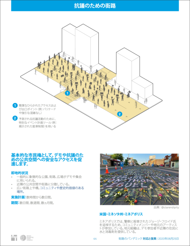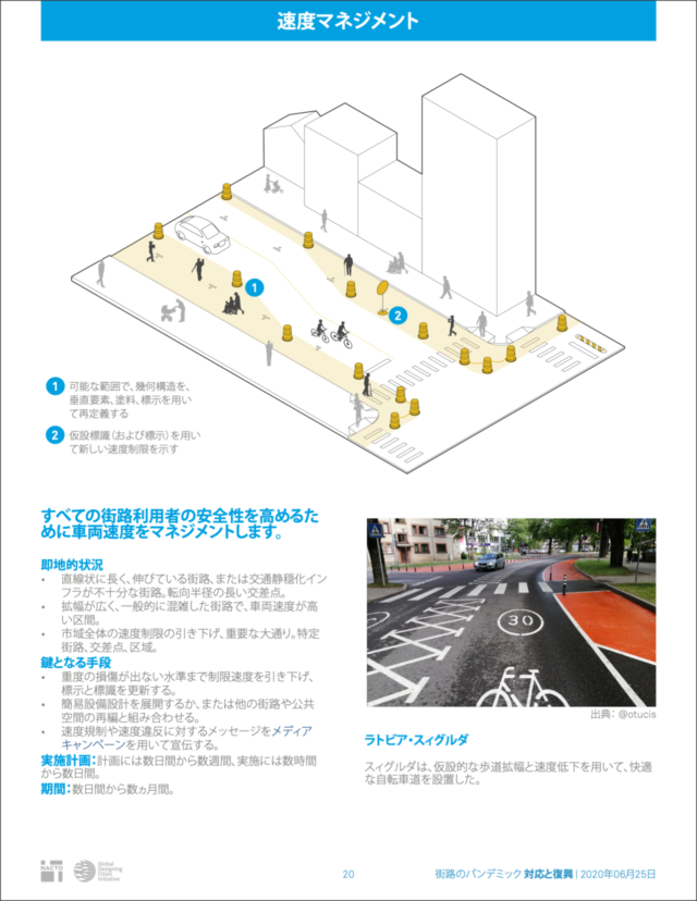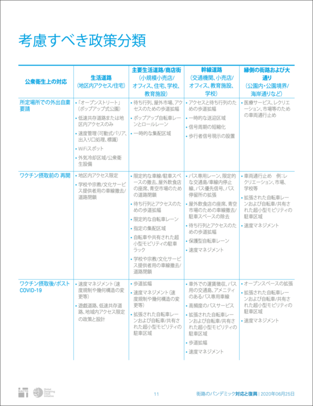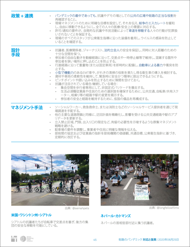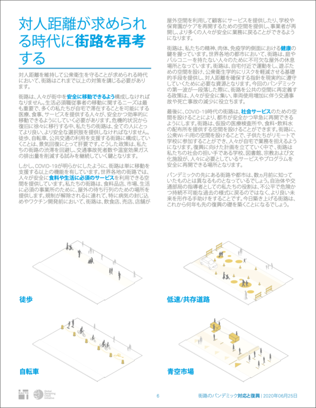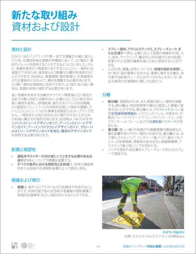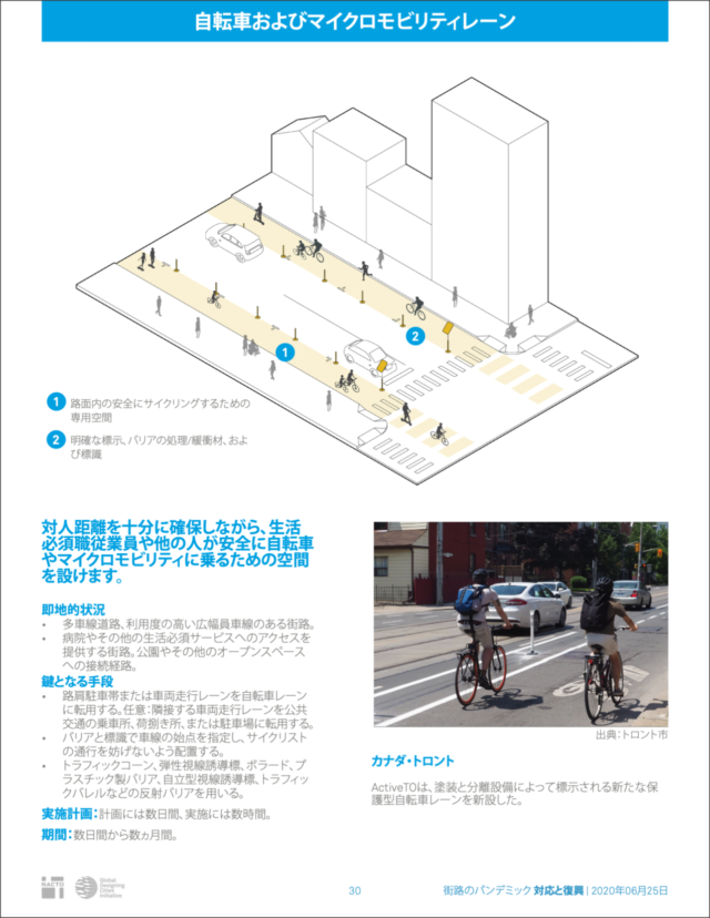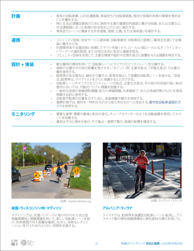 全米都市交通担当官協会(NACTO)が作成した「Streets for Pandemic Response & Recovery」は、新型コロナウイルス感染症(COVID-19)に対する世界各地のストリート・デザインをまとめたもので、英語版とともにアラビア語、イタリア語、日本語、ポルトガル語、スペイン語、トルコ語の翻訳版が公開されている。日本語版のタイトルは「街路のパンデミック 対応と復興」だ。