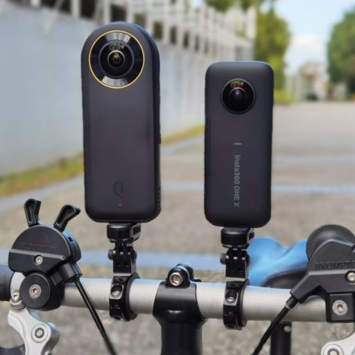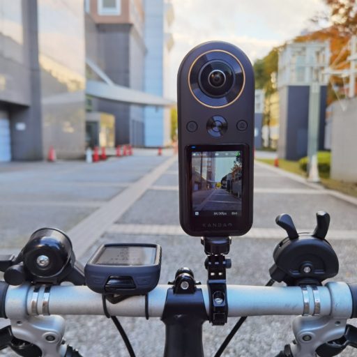 それでは、スタビライズ性能を確認するために、QooCam 8Kを自転車のハンドルに取り付けてタイル敷の歩道を走行してみよう。撮影した映像はQooCamStudioアプリケーションで書き出す。この時にAnti Shakeを選ぶと、路面からの細かい振動が抑えられry。Super Steadyは更に効果が高いが、カーブでの進行方向の変化まで打ち消すのが問題になる。左に曲がれば右を向いた状態になり、不自然だ。