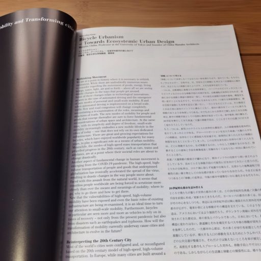 さて、ゲスト編集者でもある千葉学のイントロダクション「バイシクル・アーバニズムー生態学的都市計画に向けて」に本特集の意図が明示されている。すなわち、高速・大量の移動手段を前提とした20世紀型の都市は、自動運転やマイクロ・モビリティによって大きく変化する。それが新型コロナウイルスによって早急の課題となった今、私たちが既に持っている手段が自転車というわけだ。