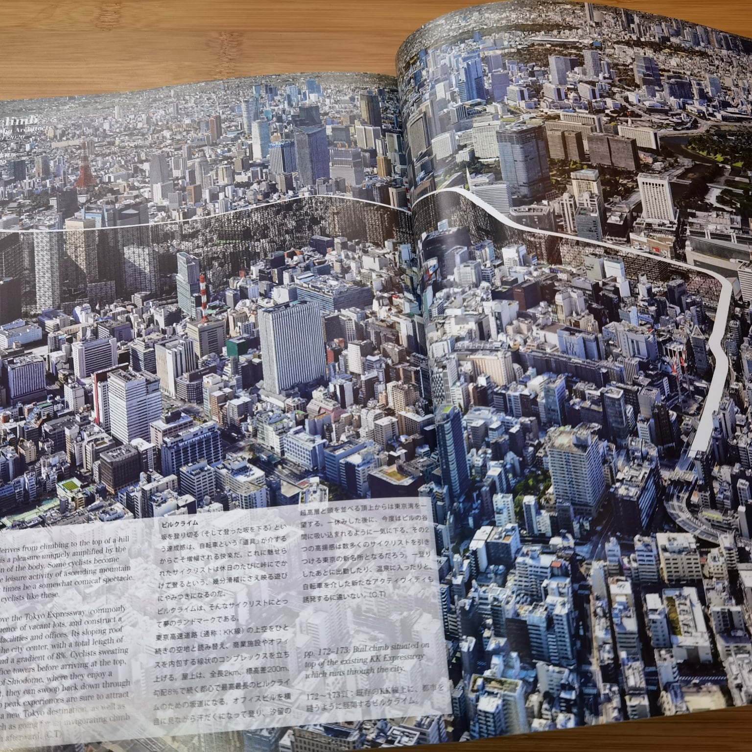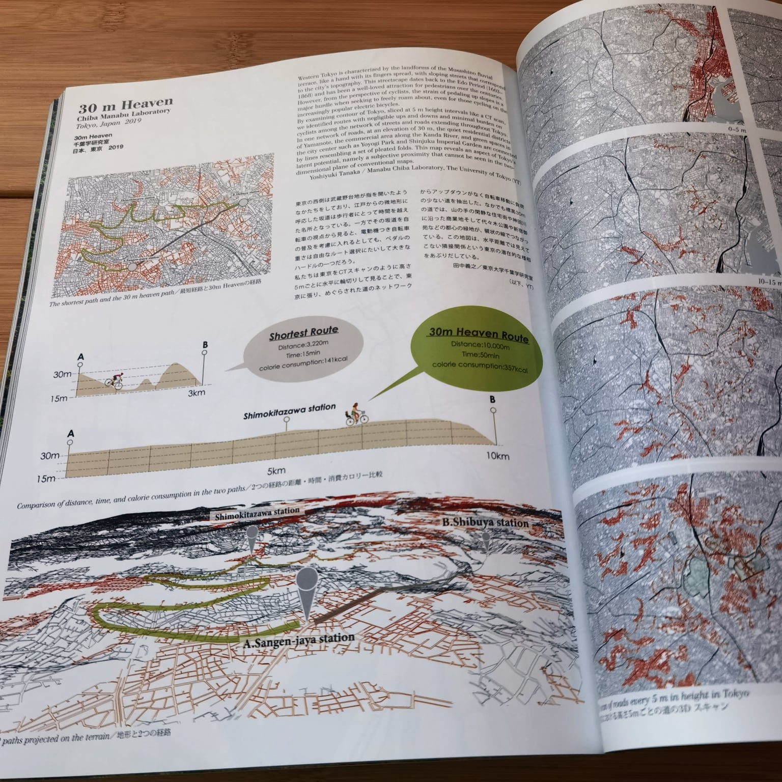 東京については、高さ5mごとにスライスした地図から始まる。これによりアップ・ダウンを最小化した走り易いルートが浮かび上がる。直線的な最短距離ではないが、快適な自転車移動には最適だ。また、東京における多彩な駐輪風景、物流エリアやオフィス街の週末に現れる高速走行コース、原宿での地域や地形の特徴を活かした建築プランなど、東京大学大学院の千葉学研究室での成果だ。