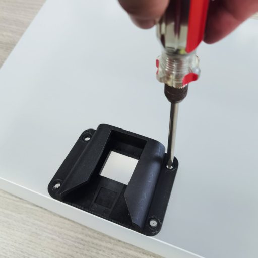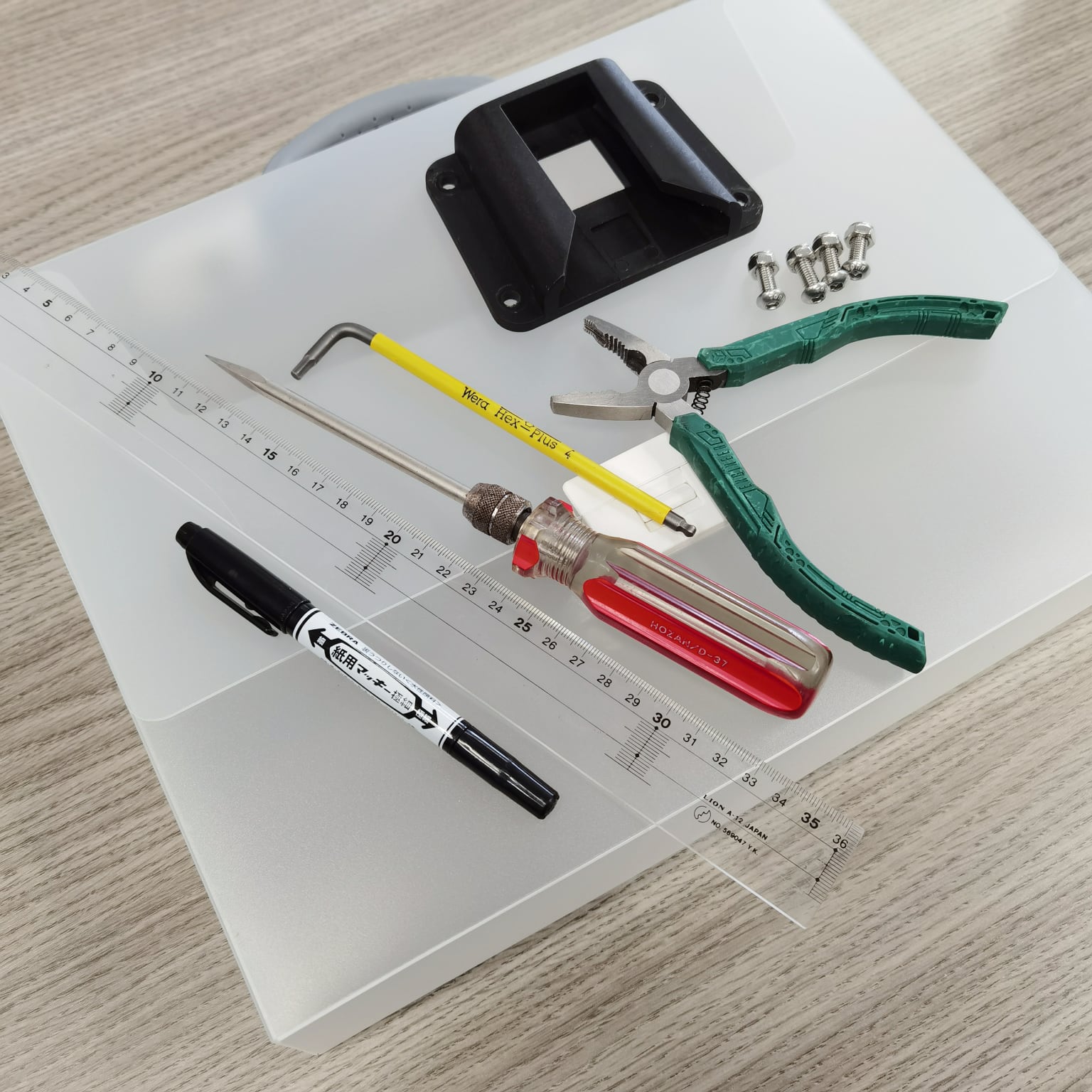 実際の作業はケースに穴を開けてボルトとナットでアダプタを固定するだけ。10〜20分もあれば良い。ポリプロピレンは柔らかいので、太めの錐でグリグリ強引に穴を開ける。電動ドリルやリーマ、ヤスリがあれば、より楽に作業できるだろう。ボルトはケースの内側から差し込み、アダプタをナット留めする。これは、ボルトの頭は丸まっているので、ケースに入れた書類などを傷付けにくいからだ。