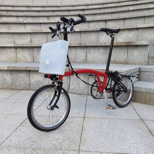 このようにして出来上がったBrompton用ケースは、目論見通り不思議な雰囲気となり、見知らぬ人から声を掛けられるほどだった。使い勝手も良く、書類やパンフレットの他に薄手の衣服や身の回りの小物などを入れるのに重宝している。半透明なので中身が朧げに分かるのも楽しい。Bromptonから取り外すと無用になるアダプタも、それほど邪魔にならない。ただ、重いものは避けるのが無難だろう。