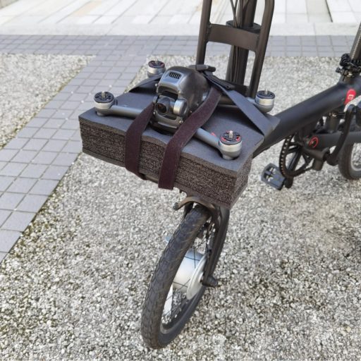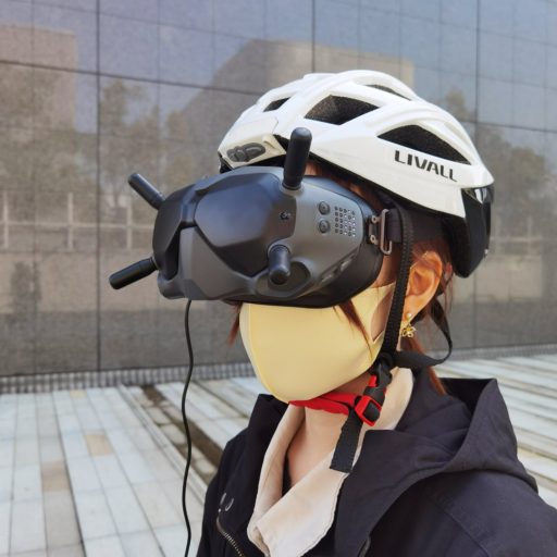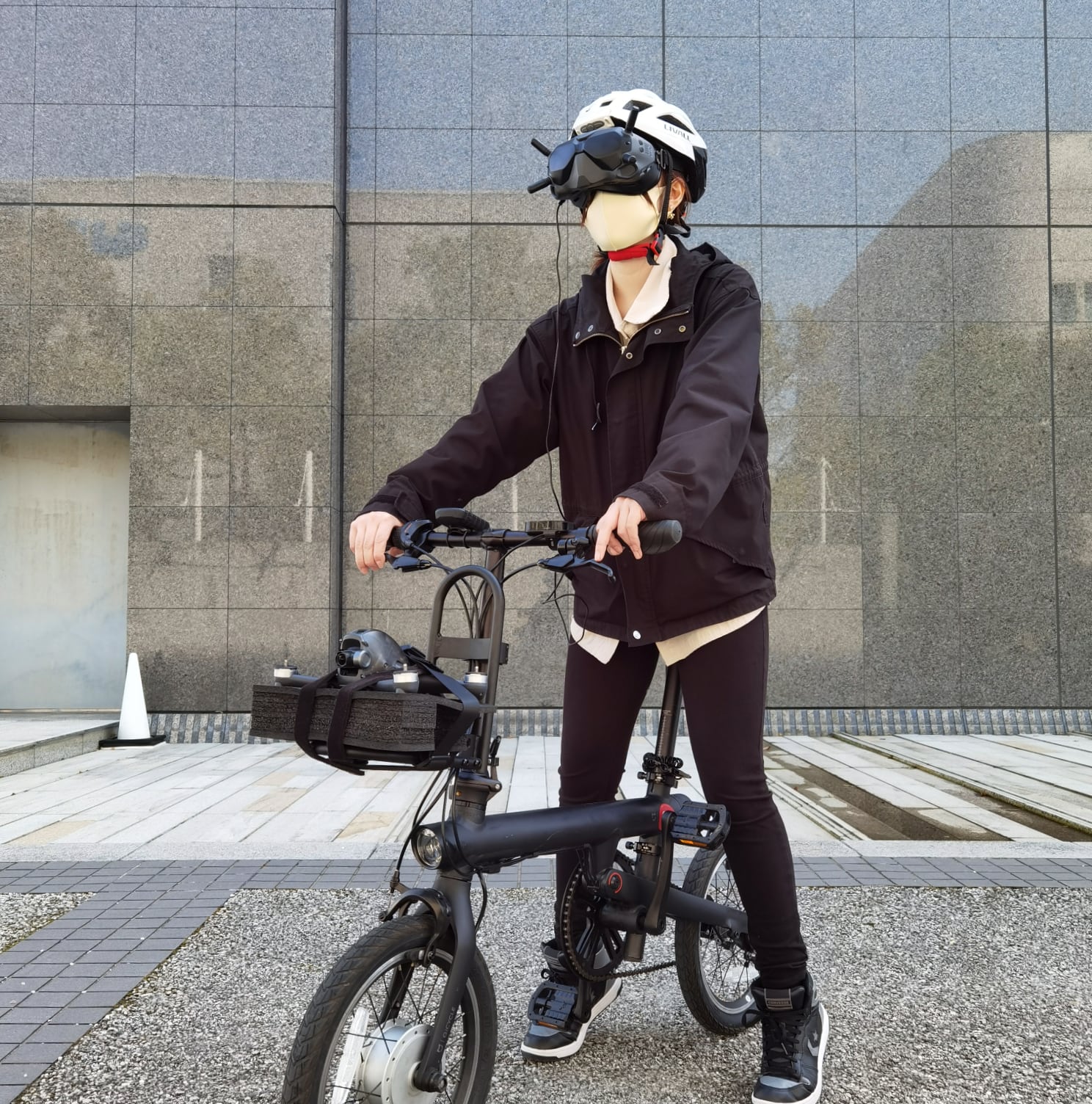 自転車に取り付けたDJI FPVから送信される映像をゴーグルで受信した映像