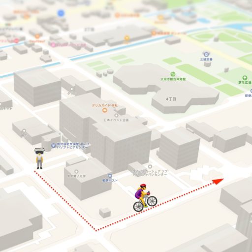 それでは他の人にドローン付きの自転車に乗って走ってもらう。佇んで見るゴーグルの映像は鮮明で、強い臨場感が得られる。自分はただ立っているだけなのに、足を動かそうとしたり、傾きに体が釣られそうになる。機関車トーマスならぬ自転車トーマスの気分だ。ただし、大きなビルに遮られると映像が途切れてしまう。もっとも小さなビルは問題はなく、障害物がない場合の映像伝送距離は6kmだ。