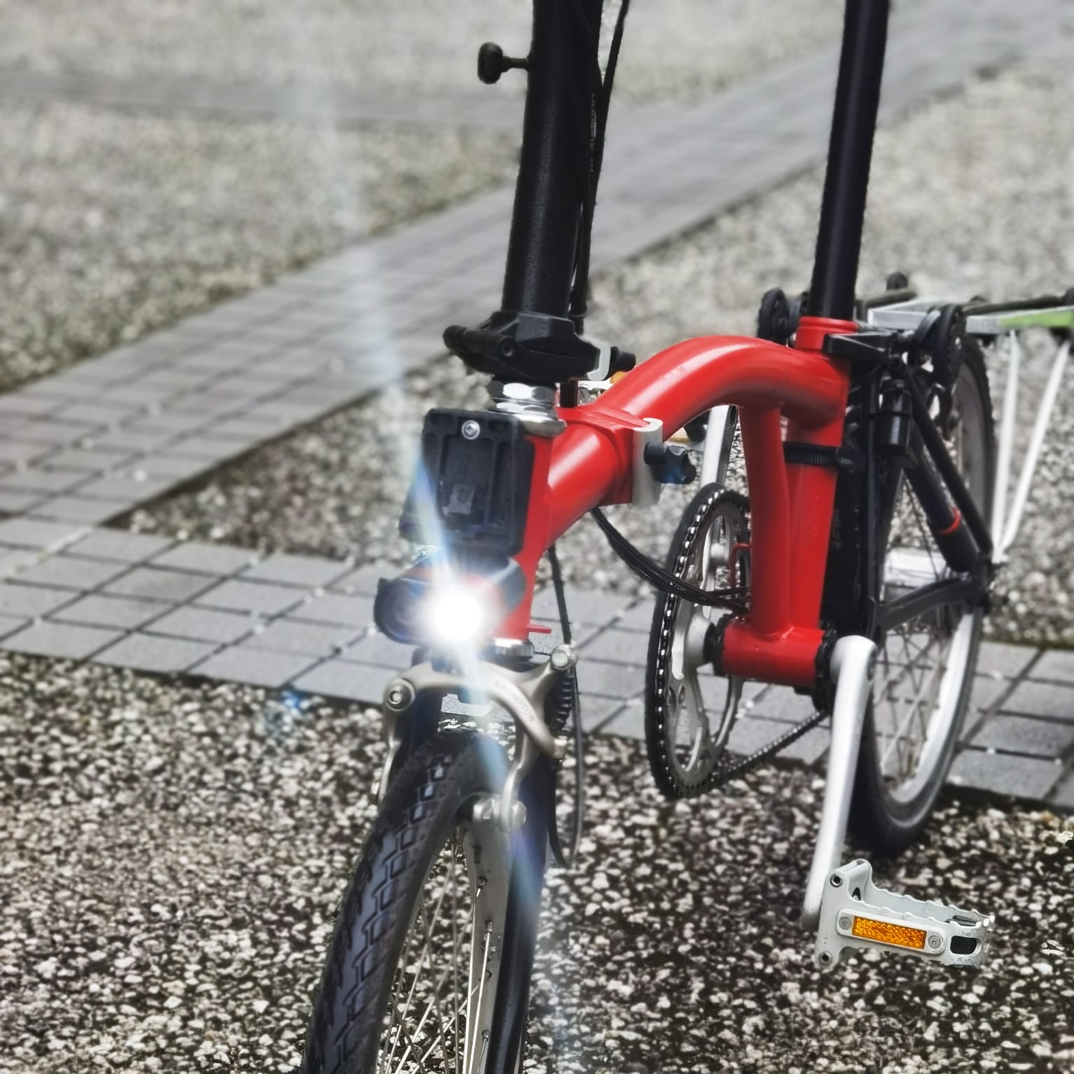 フロント用のサイクル・レコーダとして選んだのはIPTのBIKERSAY-BD001。300ルーメンのライトと容量2,000mAhのバッテリーが付いて、重量が171gと軽い。視野角は120°とアクション・カメラ並に広く、映像は最大1920×1080ピクセルで30fpsで記録される。動作時間は2〜4時間で、無料の専用アプリで各種設定や映像確認ができる。GoPro互換の取り付け具も付属し、色合いは私のBromptonに最適だった。