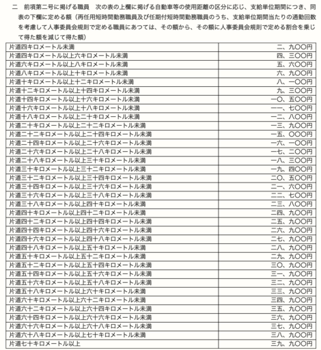 二 通勤のため自動車その他の交通の用具で人事委員会規則で定めるもの(以下「自動車等」という。)を使用することを常例とする職員(自動車等を使用しなければ通勤することが著しく困難である職員以外の職員であつて自動車等を使用しないで徒歩により通勤するものとした場合の通勤距離が片道二キロメートル未満であるもの及び次号に掲げる職員を除く。)