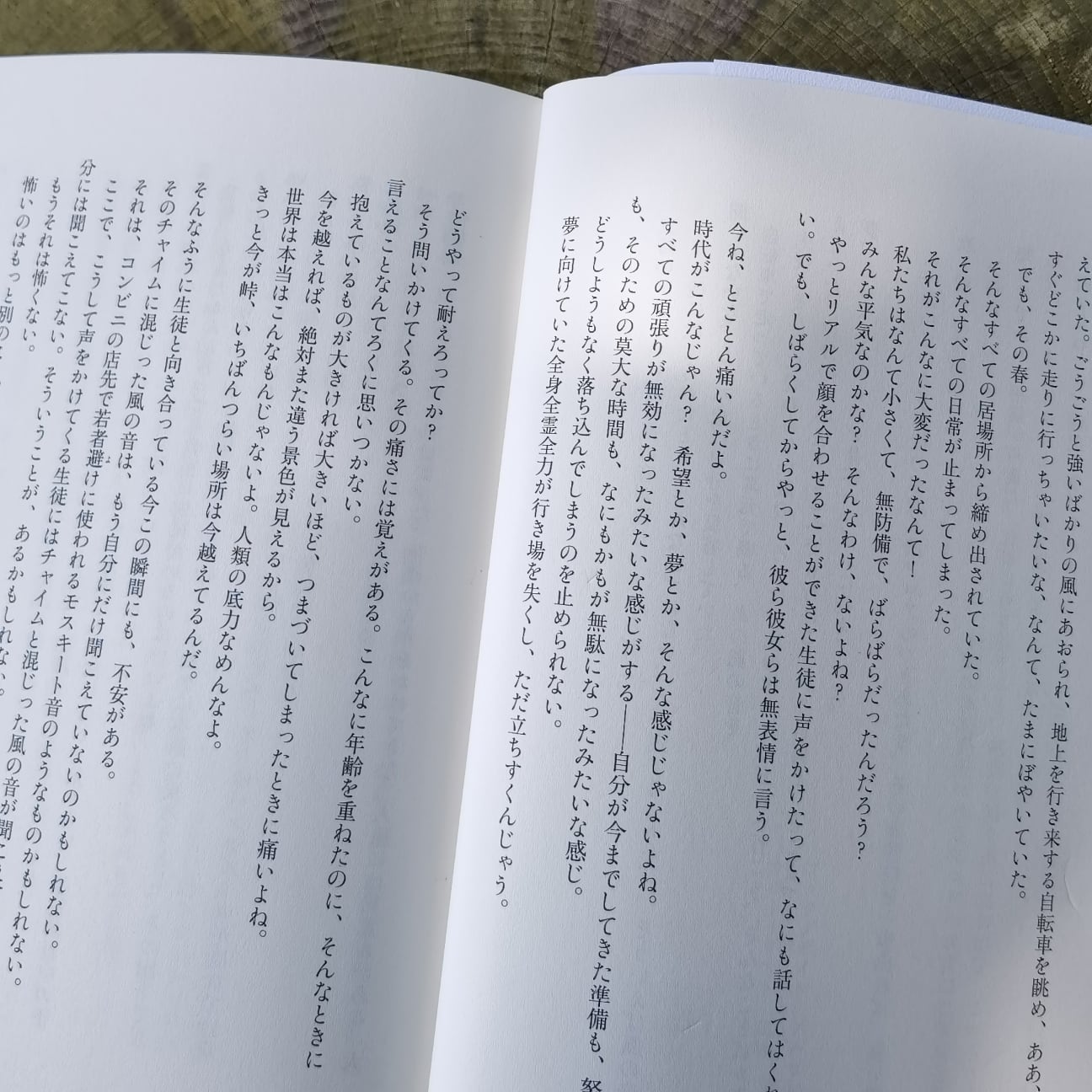 さて、物語は2020年の8月に始まり、早々にコロナ禍で憔悴した心内が語られる。「すべての日常が止まってしまった」「すべての頑張りが無効になったみたいな感じがする」「今を越えれば、絶対また違う景色が見えるから」「人類の底力舐めんなよ」などなど。消毒や清掃、オンラインの授業や会議などコロナ禍ゆえの状況描写もある。しかし、なぜかマスクや手洗い、あるいは3密回避などは登場しない。