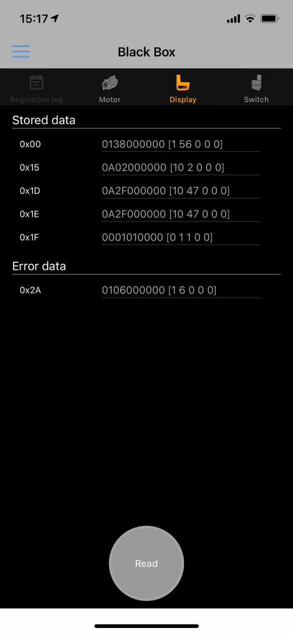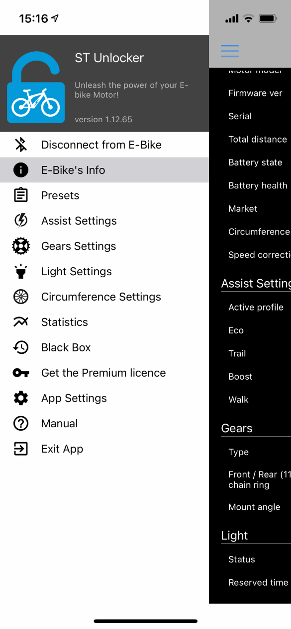 さて、iPhoneではBluetoothをオンにしてSTUnlockerを起動し、Connectボタンをタップする。次にスイッチ・ユニットの中央ボタンを長押ししてメニューを表示し、Bluetooth LEを選んで、Startを選択する。これですぐにサイクル・コンピュータがiPhoneに接続されるはずだ。STUnlockerは電動アシスト・ユニットの現在の設定を読み出す。設定データが多いのか、これには数秒かかる。