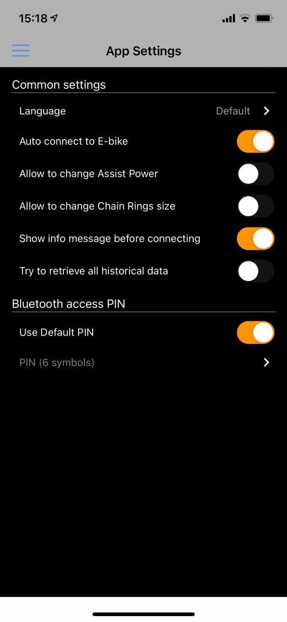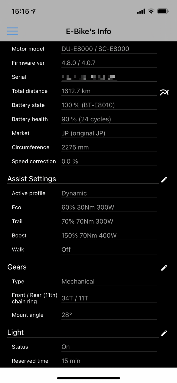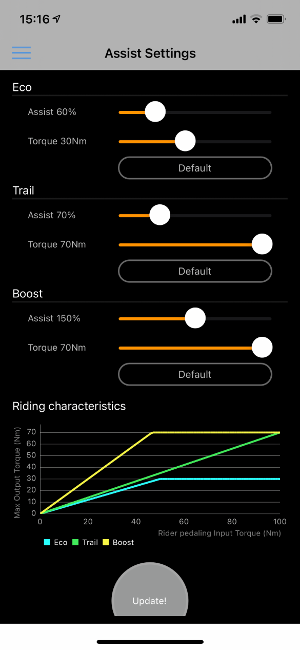 あとは機能ごとの設定画面を開いて操作すれば良い。設定を変更した場合は、下部のUpdateボタンをタップして電動アシスト・ユニットに反映させる。例えば、E-Bike’s Infoでは走行距離やバッテリー状態などを確認し、Assist設定ではモードごとのアシスト比率とトルクを設定することができる。マニュアルには各項目の詳しい説明があるので、参考にすると良いだろう。