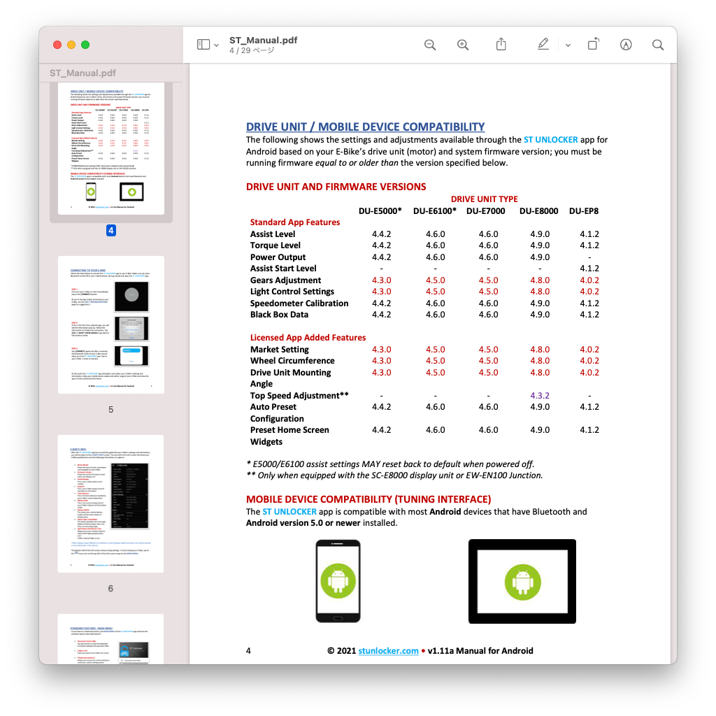 STUnlockerには、iOSおよびAndroidでBluetooth接続するモバイル・アプリと、PCでUSBインターフェース(SM-PCE02など)を用いるデスクトップ・アプリとがある。筆者はBluetooth対応のサイクル・コンピュータSC-E8000を使っているので、iOS版を120円で購入した。なお、電動アシスト・ユニットの種類やファームウェアのバージョン、そして後述するライセンスによる違いをマニュアルで確認しておこう。