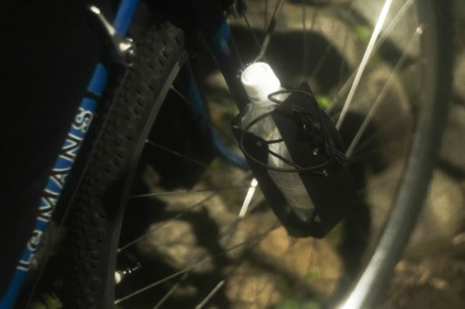 トリプルダボを有するフロントフォークの脇には、友達が考案したクイックホルダーを作成、装着。500cc程度の水を左右に配置、止まって飲むスタイルを想定。電解質はタブレットで補給。このホルダーは一つ60グラム程度と軽量で荷物の脱着が迅速に行えるのが魅力。友達は一年以上トラブルなく使えているようなので自分も試してみることにした。