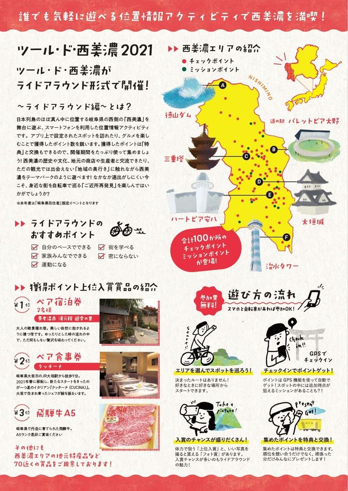 このイベントは7月21日から2ヵ月間に渡って開催され、岐阜県西美濃地方の2市9町を自転車で巡って獲得したポイントを競うことになる。このためにモバイル・アプリを使って設定されたスポットを訪れたり、ミッションを行うとポイントを獲得。集めたポイントは特典と交換でき、上位入賞者には景品が進呈される。そのあらましを伝えるビデオも公開されている。参加費はかからない。