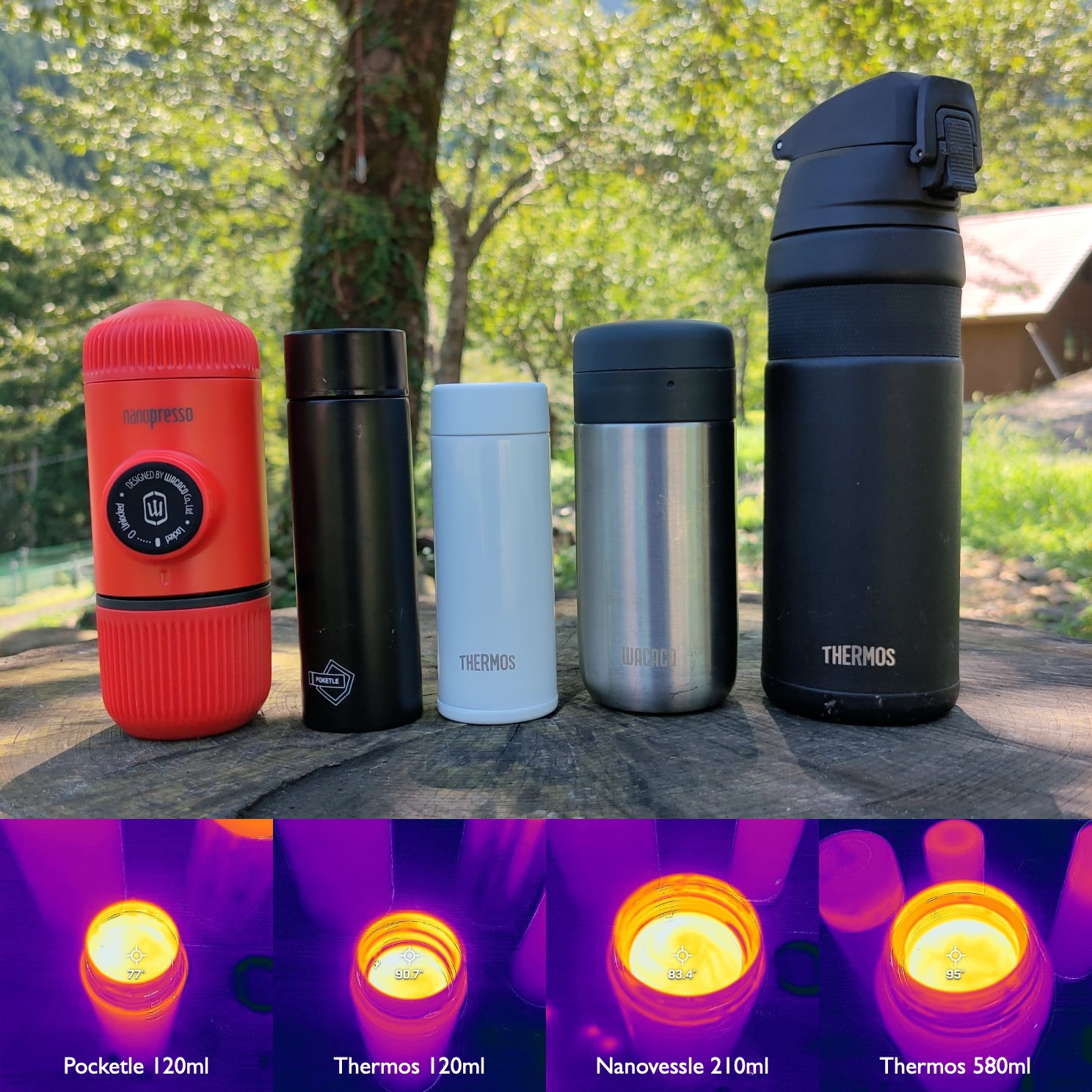 サーモグラフは沸騰したお湯を容量一杯まで入れて蓋をし、2時間後に温度を測定した。