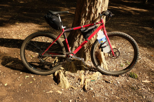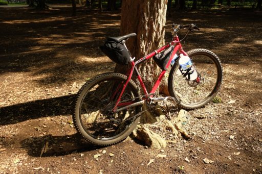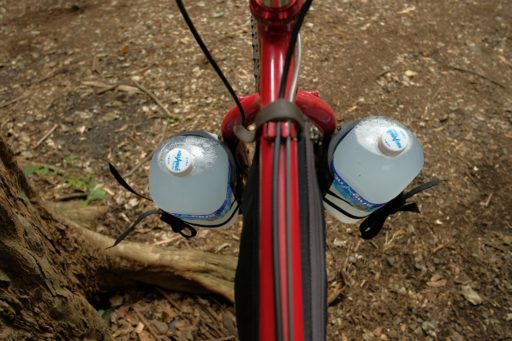 ここ一年くらいの間に度重なるフォーク交換を経てきた自分の赤いリジッドMTB。今はSurlyのBridge Clubフォークが入っていて、その後ろ寄りに三連ダボ穴が空いている。この位置への積載は試したことがなかったので、手持ちのSalsa Anything Cage HDを装着し飲料2リットルを左右に1本ずつ積んでみた。結果、低速でヨロヨロしない良好な乗り味が得られた。これには驚いた。