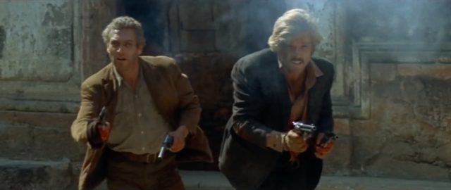 賭博から列車襲撃まで彼らは飄々と悪事を続ける。保安官が追跡を訴えるが、反撃を恐れてか志願する者はいない。その傍で商人が未来の乗り物の宣伝を始める。小さな機械が人生を豊かにする、もう馬はおしまいだ、と。翌朝、主人公の一人が空中を滑るかのように現れ、相棒の恋人を誘い出す。バート・バカラックの名曲「雨に濡れても」の調べに乗って、軽やかに自転車で駆け巡る。