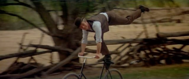 一晩で習得したのか、彼女をハンドルに腰掛けさせて二人乗りでペダルを漕ぐ。通り過ぎる樹木の下で、枝から林檎をもぎ取って頬張る。そう、知恵の実だ。さらに強盗業で鍛えた身体能力の高さで、次々と曲芸乗りを披露する。両足をハンドルにかけて手を離し、サドルに腹這いになり、サドルに片足で立つ。挙句の果てに後ろ向きになって進み、前を見ていないので柵に激突してしまう。