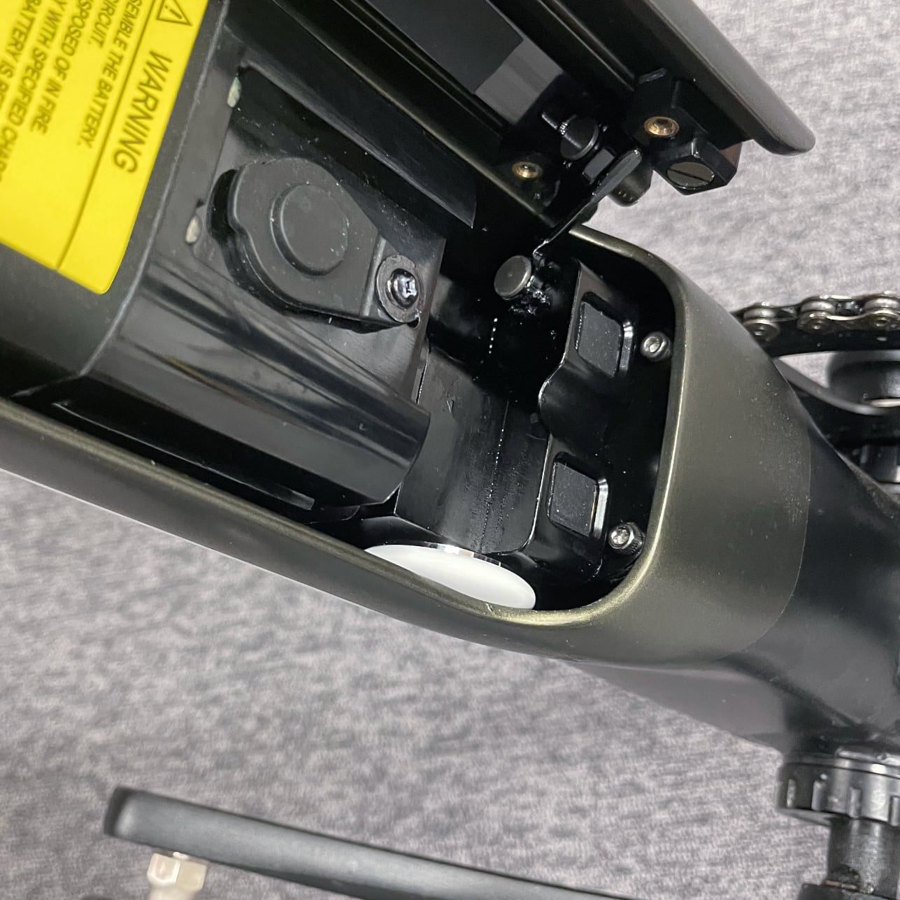 置き忘れや盗難時の自転車の発見のために、AppleのAirTagが欠かせない。ただし、簡単に外せない場所に取り付けることが望ましい。JG1についてもあれこれ試していたところ、フレーム内部のバッテリー横にAirTagがピタリと収まることに気が付いた。ここはキーでロックするので、フレームを破壊しない限りアクセスできない。ほぼ完璧だが、無理に押し込むと手が届かない奈落に落ち込むので要注意。