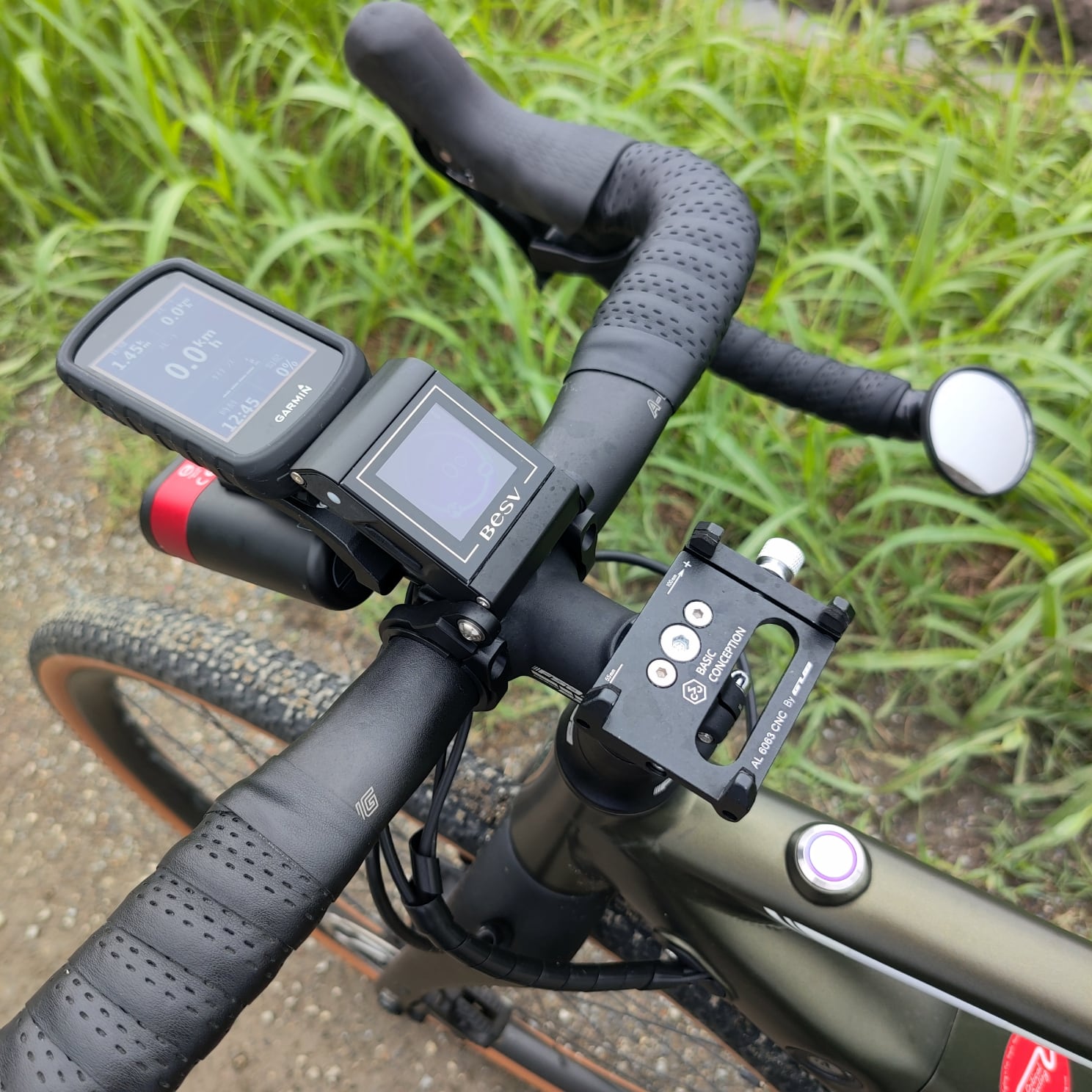 JG1付属のサイクル・コンピュータは見栄えが悪く、実用性に欠ける。そこで、普段利用しているGarmin Edge 830(以下、Garmin)を利用すべく、ステムボトムに取り付けるXOSSのマウンタBiciを取り付けた。付属のサイクル・コンピュータは手前に移動してGarminと共存させている。可能であれば取り外すか、目立たない場所に移したい。なにしろ目に入ることが多く、JG1最大の汚点と言うしかない。