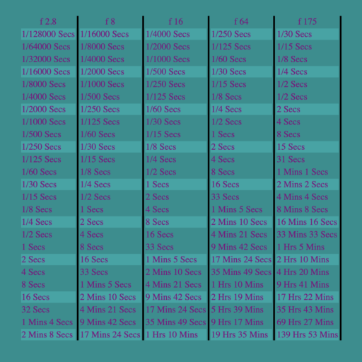 The Pinhole Galleryでは主なF値に対応した露出時間の表が掲載されているが、今回筆者が用いるf/175に対応した表はなかったので、サイト内で紹介されているLarry Fratkinさん作のツールを使用した。これに任意のF値を入力することで表が生成され、露出計等で得た通常のカメラを使用する際の露出時間からf/175を使用する際の露出時間を導き出すことができる。F値がはっきりしているピンホールカメラとこの表があれば、ある程度の露出時間の調整を行うことが可能となる。