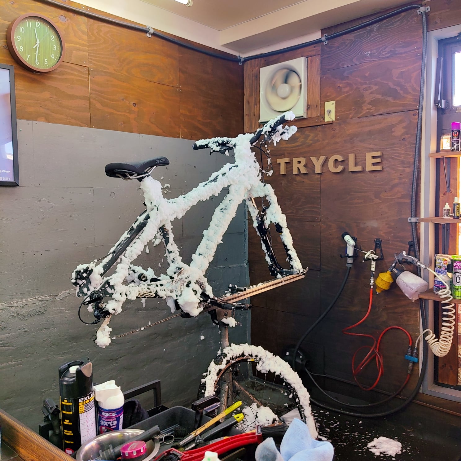 トライクルはJR南武線の矢野口駅から徒歩数分のこぢんまりとした店舗。洗車スペースでは車輪を外した自転車をワークスタンドに載せ、手慣れた様子のスタッフが洗車を進めている。ハケで細かな隙間に溜まった埃を掻き出し、車体を白い泡で包み込んで洗い上げ、最後に車体をワックス・コーティングで仕上げる。手際良い作業に感心するとともに、潔癖症を掻き立てかねないほどムズムズしてくる。