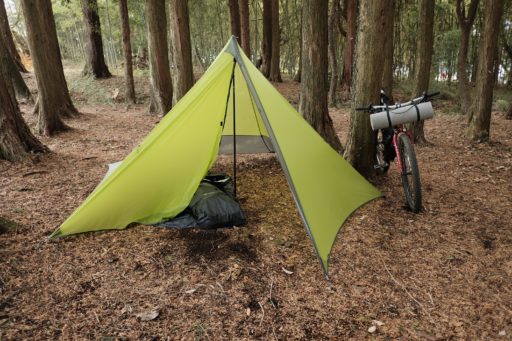 大して走っていないのにヘロヘロになってキャンプ場へ到着、まずは寝床の設営。今回もモノポールのフロアレスシェルターを使用。12月の富士周辺は流石に寒いと思ったので、寝具はフォームパッド+エアマットにモンベルの2番シュラフ、さらにエスケープビヴィをインナー使い。輪行袋も持ち物を置いておくスペースの敷物に。ポールは現地調達(太い木の枝を探す)ではなく専用品を持参。