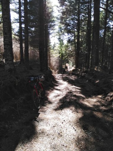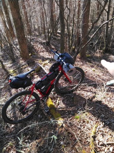 今回の狙いの道は、結論から言うと自転車で行くのに適したところではなかった。楽しいグラベル区間はほんの少しで(※逆側から入れば違うかもしれない)、トレイル的な区間も人があまり通っていないらしく(全く、ではない)軽度の藪漕ぎや倒木跨ぎ・くぐりが延々と続いた。少し開けたと思えばエッジのギザギザした火山岩の小ドロップオフが連なっていて、キャンプ装備で乗ったまま走るにはちょっと厳しかった。とはいえこういうのも面白いのだ。先行きの不透明な探索もバイクパッキングの大事な要素(※安全第一)。