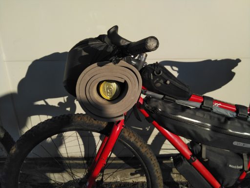 寝床は総合的にかなり快適だった。地面側はエアマットが滑ってズレないようになるべく平らなスポットを選び、またグリップがよく断熱性能もそこそこあるフォームパッドを下に敷いたので安定していた。片方だけでもいけたのかもしれない。エアマットのズレとパンク防止が主目的なら下敷きはもっと薄いフォームパッドでもいいだろう。輪行袋でも品物によっては代役になりそうだ。シュラフは初め単体使用だったが少し寒くて目が覚めたのでエスケープビヴィを中に入れたところポカポカで快眠できた。衣類もそれなりに着込んで(最終的な詳細は記憶にない)、靴下は脱いでいた。使い捨てカイロは投入せず。バックアップの残し具合としては上出来だと思う。要検討事項は次の通り。