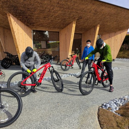 GREENable HIRUZENのサイクリング・センターは上下反転した藁葺き屋根がユニーク。側面は木とガラスで開放感に溢れ、TREKのマウンテン・バイクがずらりと並べられている。電動アシストや子供用もある。夏にオープンしたこともあって、いずれもピカピカの新車状態。なぜTREK?と尋ねると地元の自転車屋さんの選定とのことで、TREKが協力しているわけではないらしい。