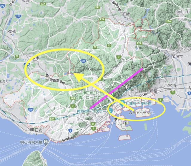 神戸市は港町として知られており、都市部は上の地図のうち、右下側の黄色い円で示しているような、海の近くで発展している。神戸農村サイクリングが設定されているサイクリングルートは、地図の左上の黄色い円で示した地域にある。この両地域の間には、自転車乗り達にとってヒルクライムが盛んな六甲山系が横たわっている。この土地の形はそのまま、現在の自転車の社会における課題を現していると捉えることができると考える。