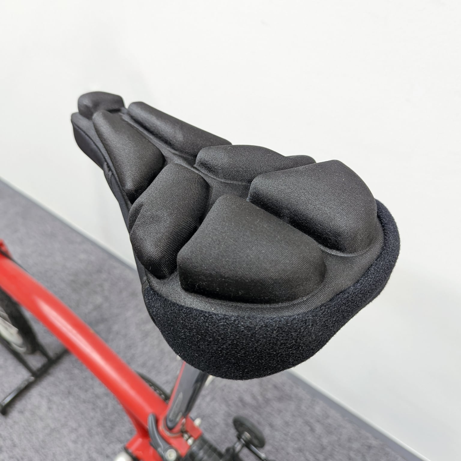 固いサドルであっても、クッションが付いたカバーをかければ良い。ママチャリなどでよく見かけるし、種類も多くある。しかし、これも柔らか過ぎるのはダメだし、カバーがズリ動くようなら失格だ。その点でクラウドファンディングで入手したTecSeatのSoftAirSeat Bikeは良好だった。左右前後に分かれたブロックがペダリングでの体重移動に追従し、溝によって通気性も確保されている。