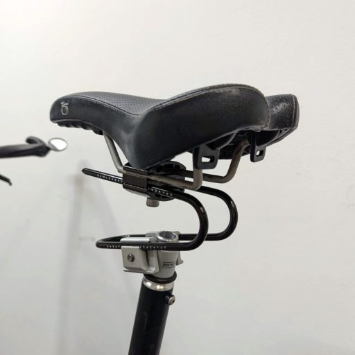 路面振動吸収の王道は太いタイヤと柔らかいサドルだ。もっとも、Bromptonには太いタイヤを取り付けられてない。以前の記事でも紹介したセラSMP(Selle SMP)のTRKはいまだにお気に入り。ゲル入りでボリューム感たっぷりの形状は、柔らかく振動を抑えてくれる。ただ、実際には意外なほど沈むことなく、しっかりと腰を支えてくれる。ペダルを漕ぐ力が逃げることもないようだ。