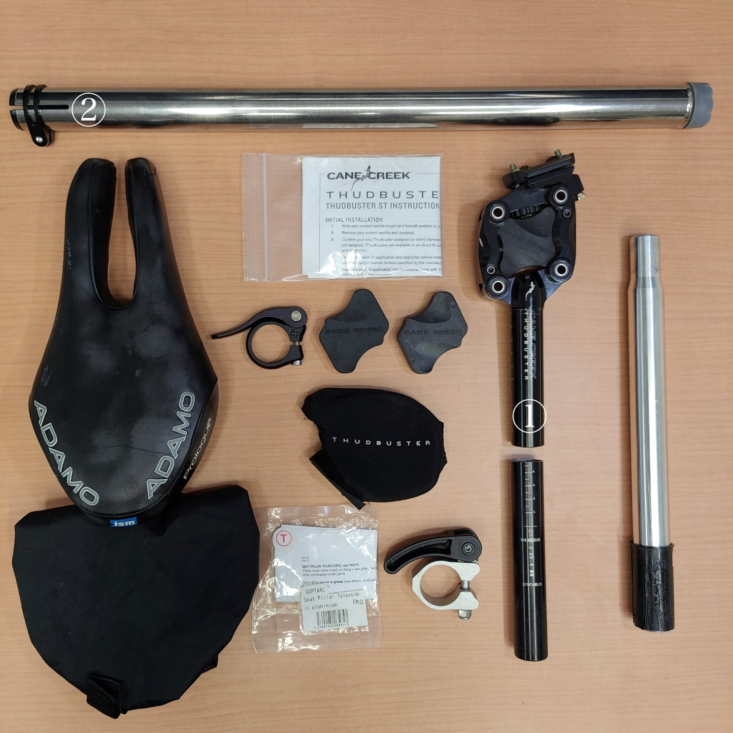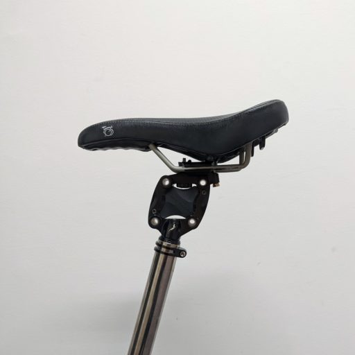 エラストマーと呼ばれるゴム弾性素材を使ったサスペンション・シートポストもある。スプリング式よりも高価で、ハイブリッド・マシン的な機構が期待を煽る。しかも、Bromptonに適合するテレスコーピック・シートポストを使った改造品をフリーマーケットで発見、千載一遇とばかりに購入した。実際にも走行性を損なわない振動吸収性は好印象。もっとも重量が増え、折り畳み時に嵩張るのが玉に瑕。