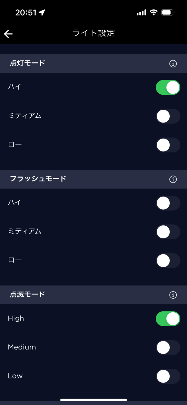 | ライトの設定 | FLY12 CE(フロント) | FLY6 GEN 3(リア) |