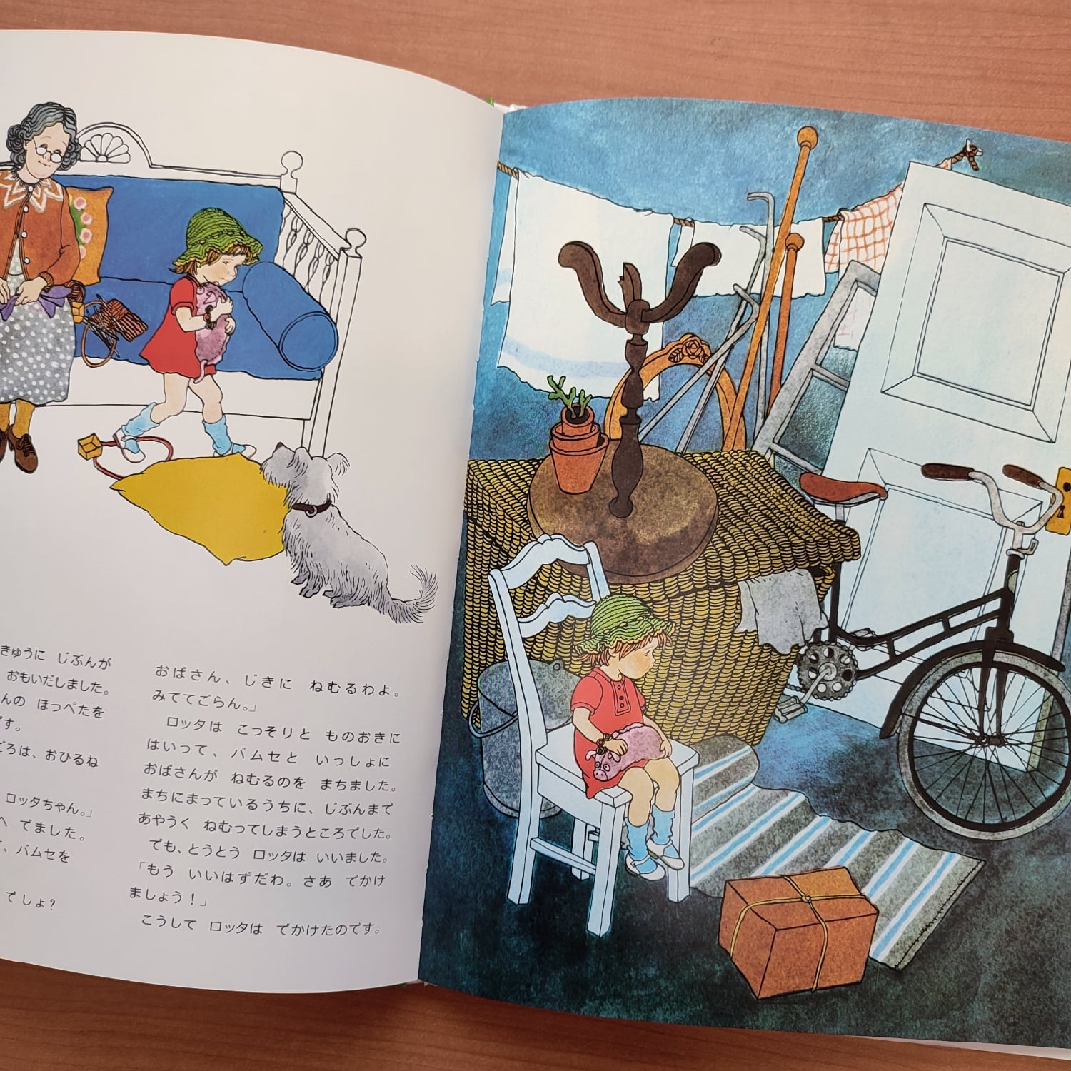 ロッタは自転車が欲しい。兄や姉が颯爽と乗っているからだ。何でも一緒でないと気が済まないお年頃。5歳の誕生日に期待していたが、まだ早い、三輪車で我慢しなさい、とたしなめられる。そこで近所のおばさんの物置から自転車を失敬する。だが、まともに乗りこなせるはずもなく、坂を転がり、生垣に突っ込んでしまう。不貞腐れていると、パパが小さな赤い自転車を持ってきて…といったお話。