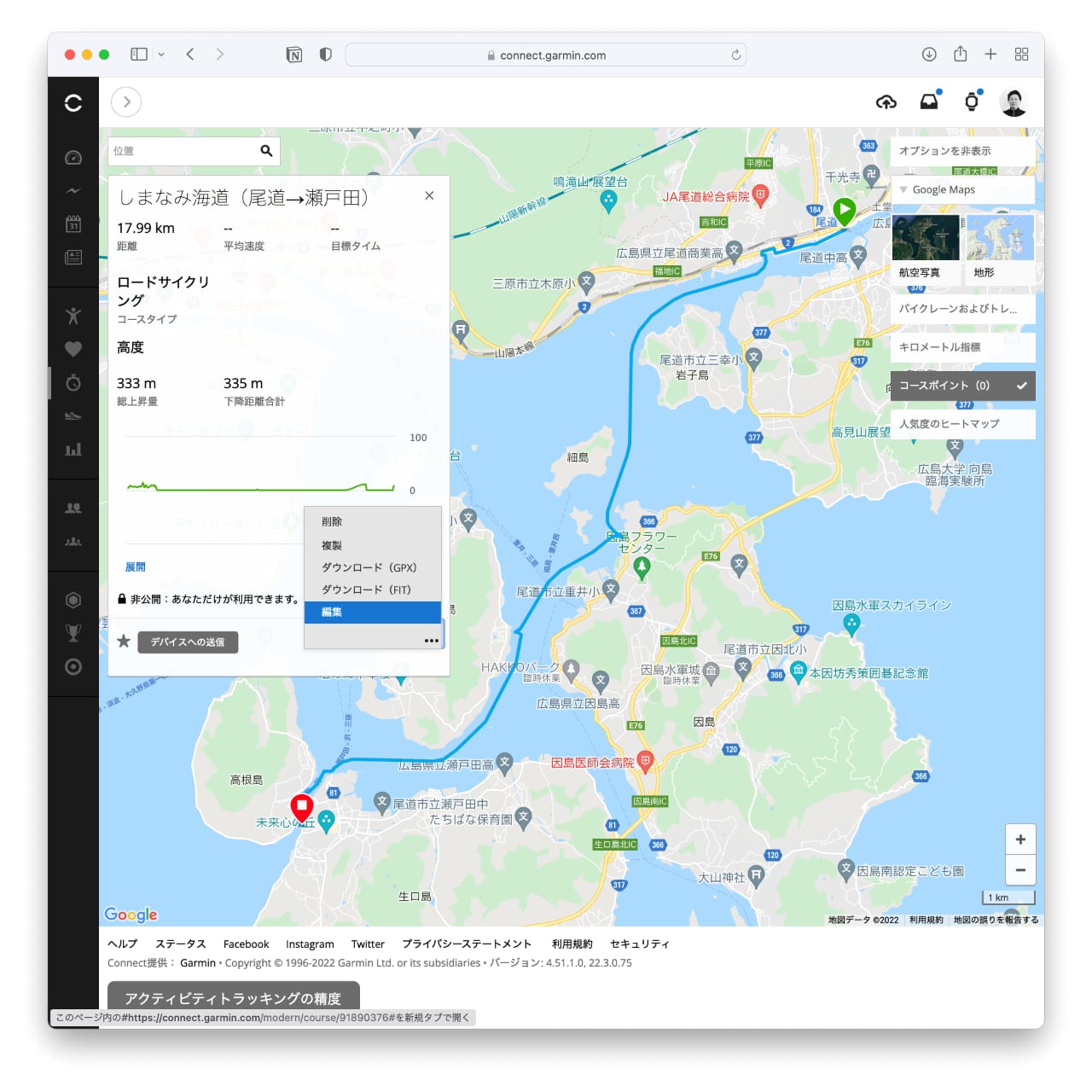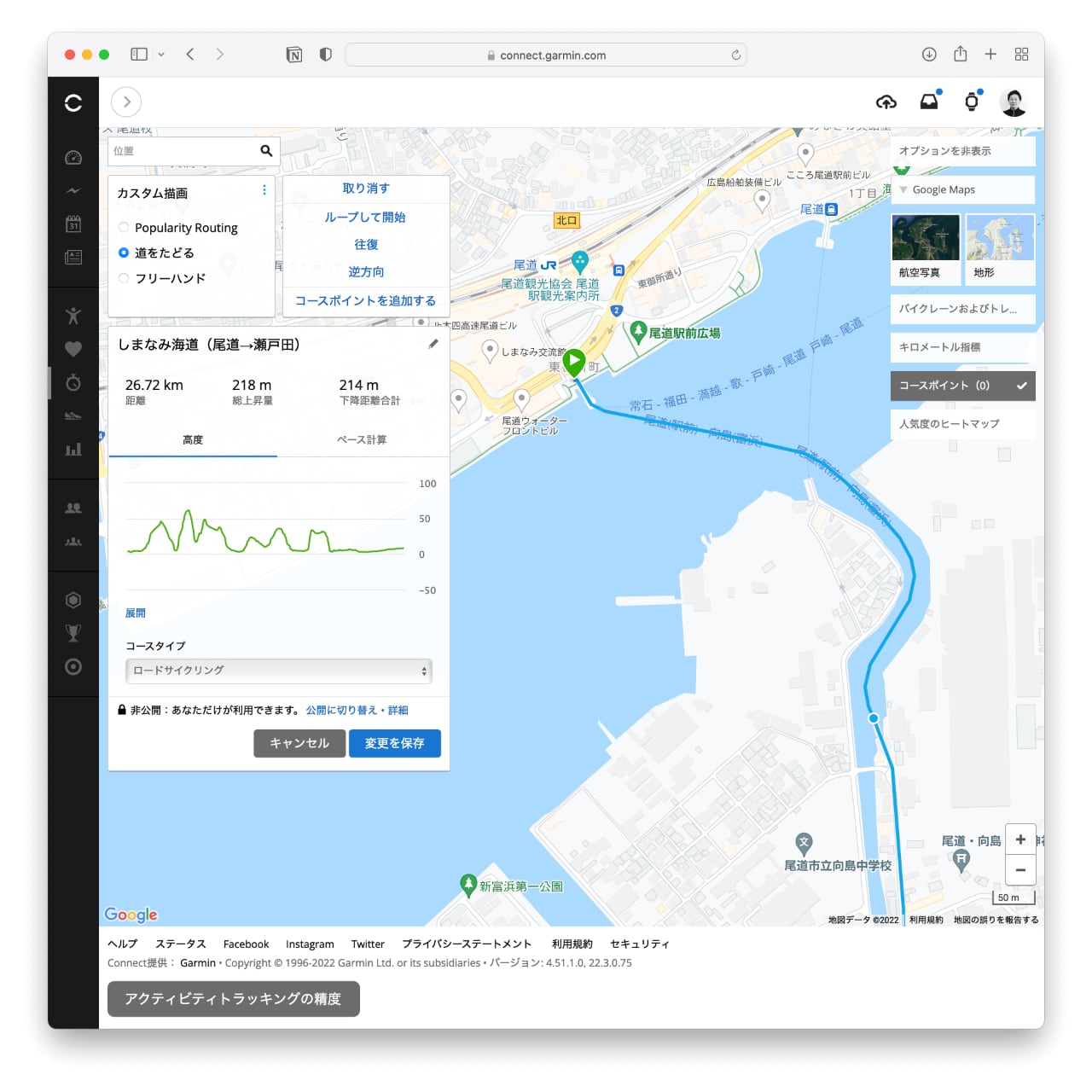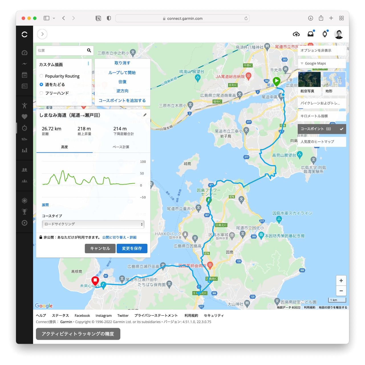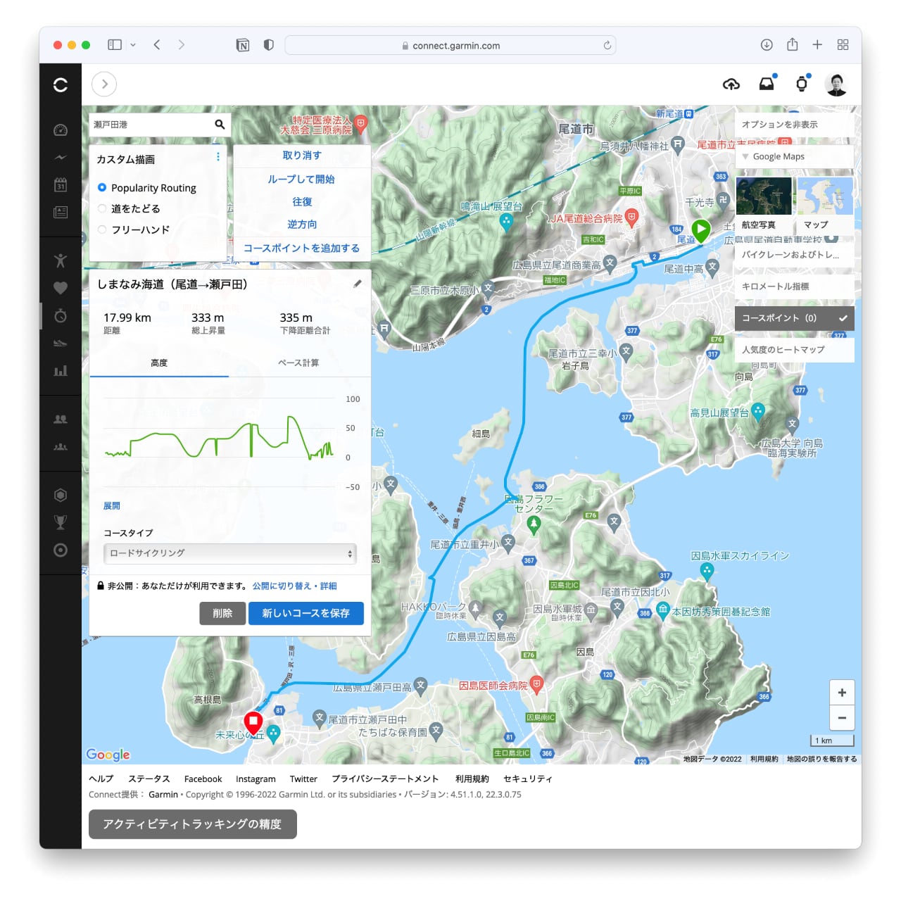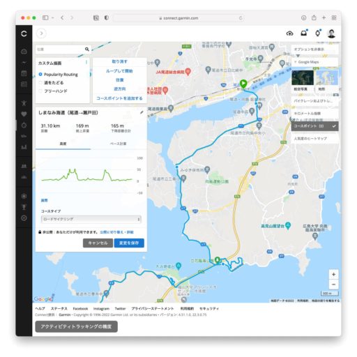 今回はしまなみジャパンのモデル・コースを参考に編集した。また、筆者は実走の経験あるので、その時の記憶も大いに役立った。結果的に3つのポイントを追加するだけで完成したのは、多くの走行履歴があるからだろう。通常は多くのポイントを追加して試行錯誤することになるが、それもまた楽しい。左側の高度グラフや周辺の観光情報を見たりしながら、コースを練り上げよう。