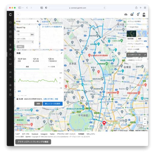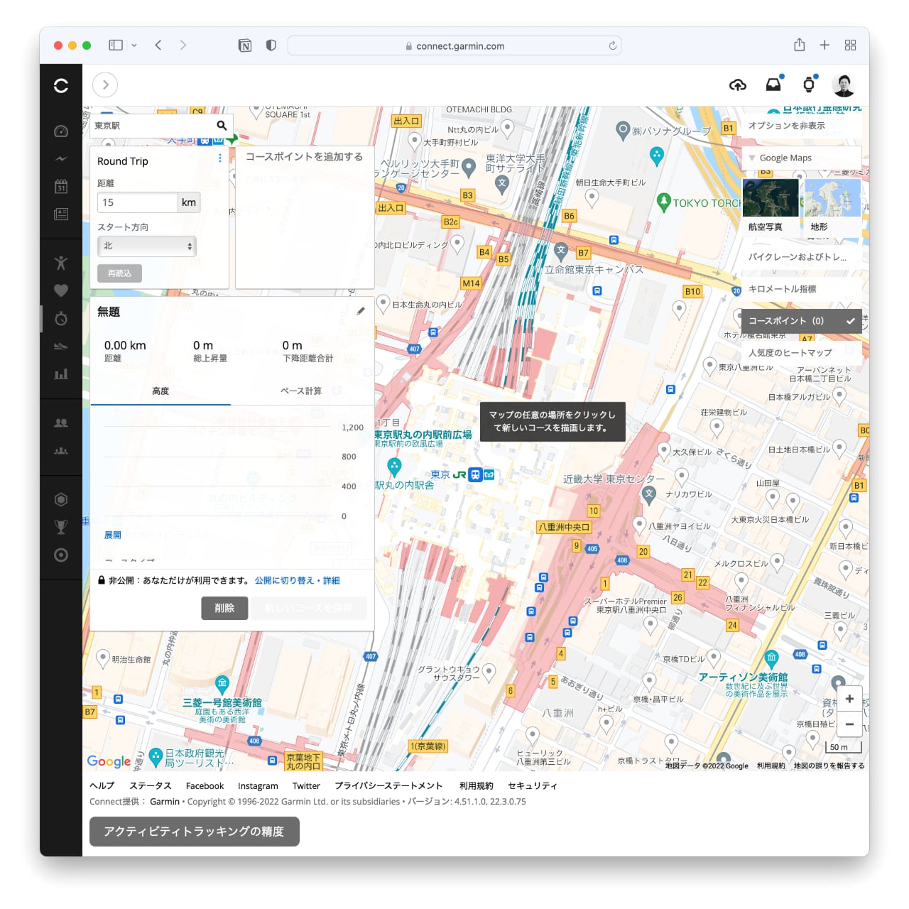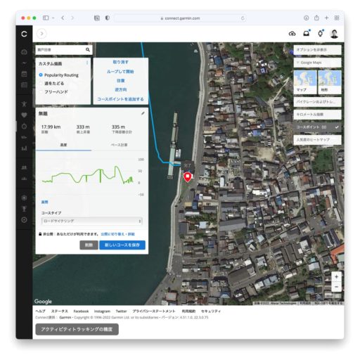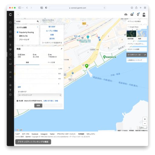 Garmin Connectで新しいコースを作成するには、マップ上でスタート・ポイントとゴール・ポイントをクリックする。これで自動的に2点を結ぶコースが描かれる。各ポイントを探すには左上の検索ボックスで大まかに探し、地図を拡大して適切な場所を決める。マップは航空写真にすると分かり易いことがある。ストリート・ビューは使えないので、別ウィンドウでGoogleマップを開いておくと良いだろう。