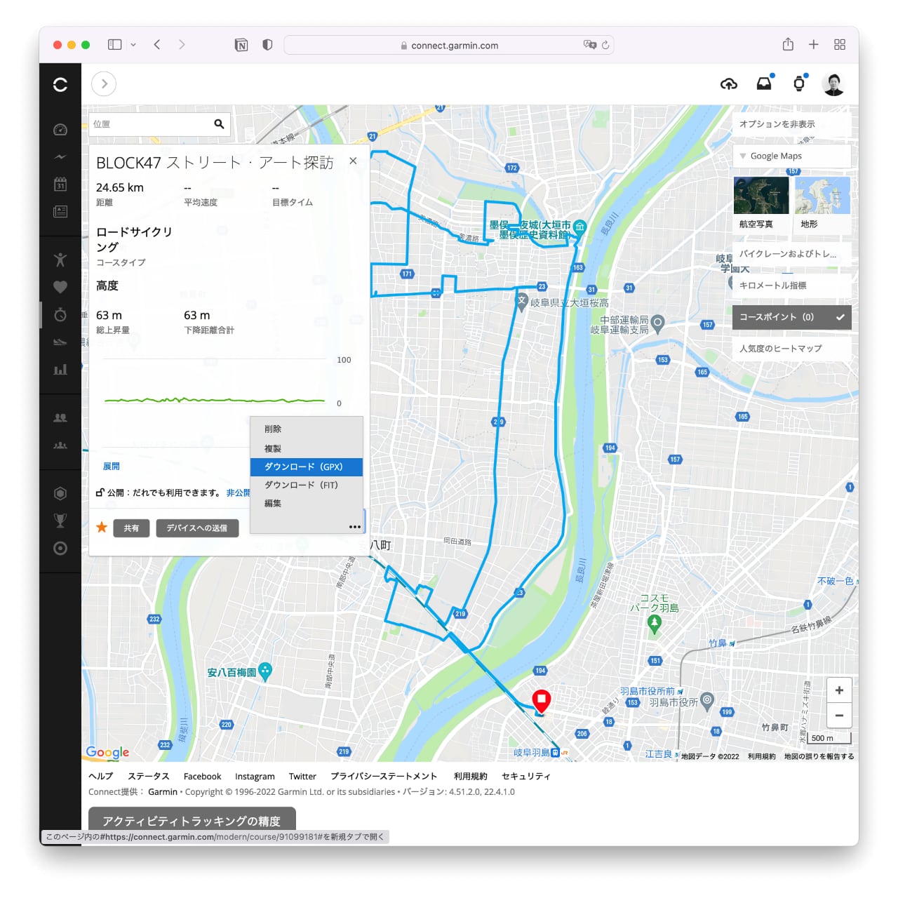 まず、コンピュータのWEBブラウザでGarmin Connectを開く。そして作成したコースを開き、GPX形式でダウンロードする。ここでは新しい自転車施設BLOCK47から周辺のストリート・アート(壁画)を巡るコースを題材にしている。ダウンロードしたファイルは「COURSE_91099181.gpx」などと素っ気ないので、コース名を付加しておくと後にコースが増えた時に混乱しなく済む。