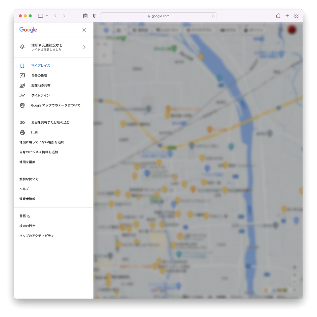 Googleマップの左上メニューからマイプレイスを選ぶ。