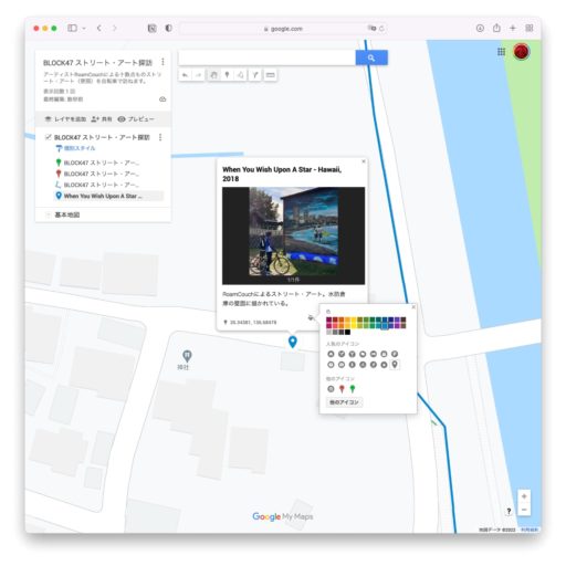 マイマップではマーカーを打って、その地点の情報を表示できる。マーカーには名称と説明文、そして色付きのアイコンが設定可能。さらにマーカーには画像や動画を含めても良い。また、飲食店などGoogleマップに登録されている地点は、そのままマーカーとして追加できる。このマーカーもGoogleマップでの情報に加えて、独自の説明や画像、そしてアイコンを設定できる。