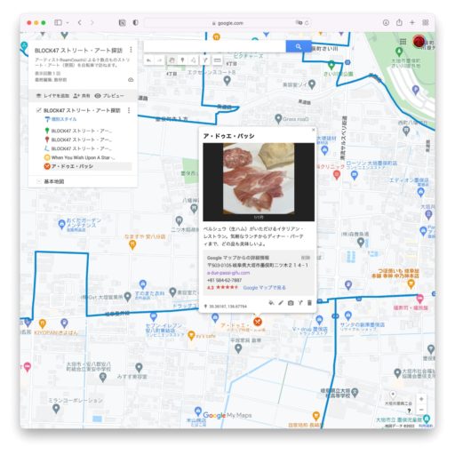 飲食店などGoogleマップに登録されている地点は、そのままマーカーとして追加できる。このようなマーカーには住所や電話番号、ホームページ、評価、写真などが自動的に含まれる。また、元々のGoogleマップへのリンクもある。しかも、他のマーカーと同様に説明や画像を追加できるし、アイコンと色も設定できる。つまり、Googleマップの情報と独自の情報が合わさったハイブリッド・マーカーだ。