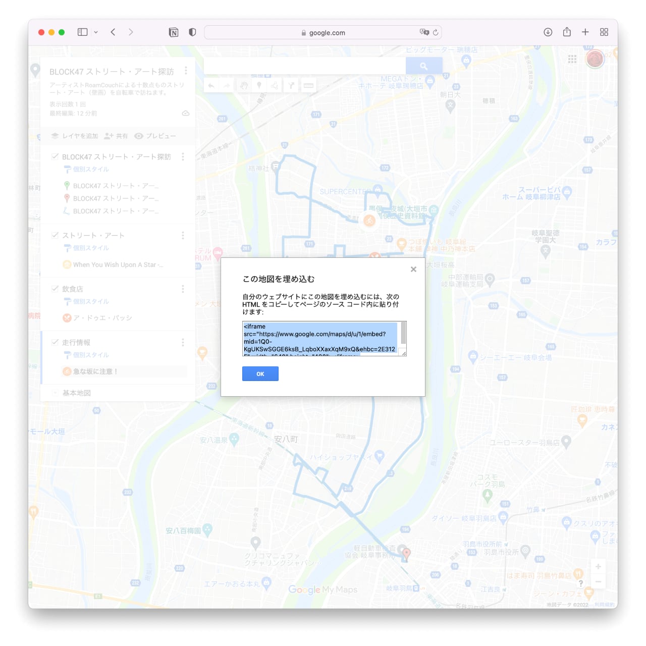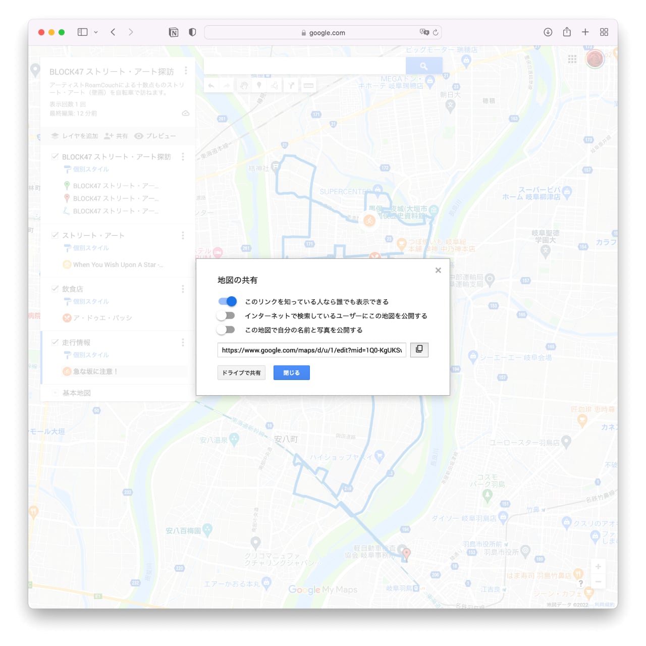 このマイマップのURLが表示されるので、必要に応じてコピーする。