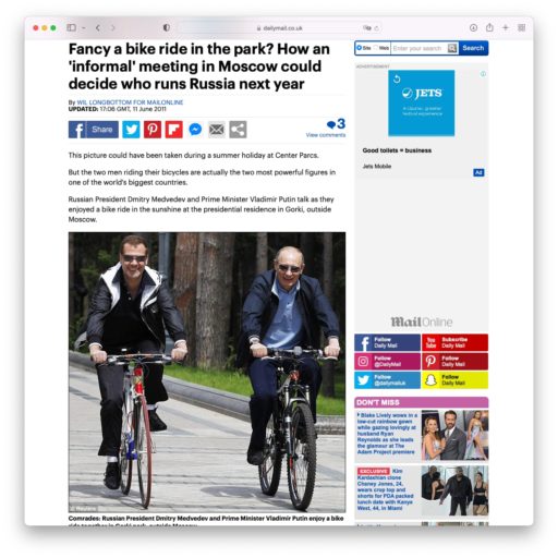 ロシアの大統領ウラジーミル・プーチン(Владимир Владимирович Путин / Vladimir Vladimirovich Putin)が自転車(велосипед)で緑豊かな公園を走る映像がある。フラフラと乗るのはフル・サスペンションのマウンテン・バイク。機関銃は付いていない。並走するのはタンデム体制の盟友ドミートリー・メドヴェージェフ(Дмитрий Анатольевич Медведе / Dmitrii Anatolievich Medvedev)。